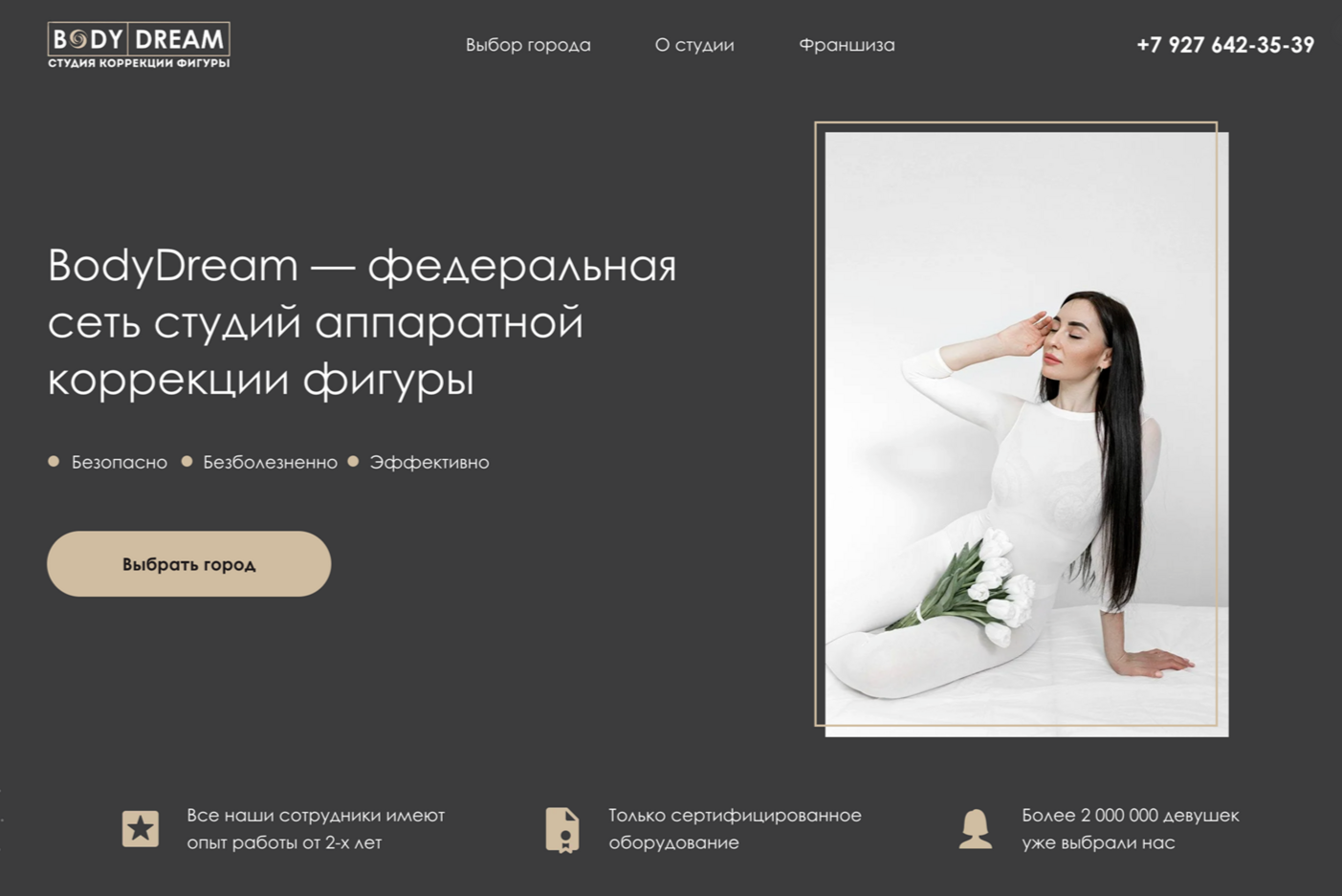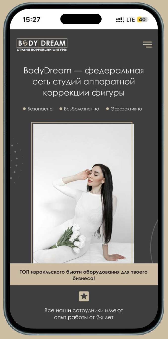 «Body Dream» — студия аппаратной коррекции фигуры. Хотели подчеркнуть безопасность процедур, реальные результаты и атмосферу заботы. Важно было дать простой путь к записи и ответить на частые вопросы.