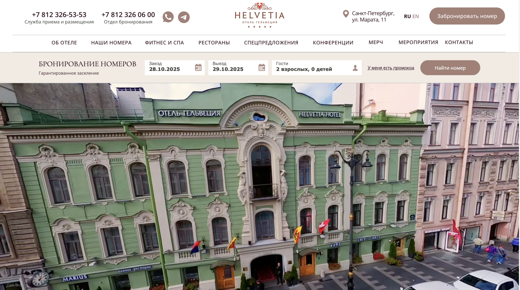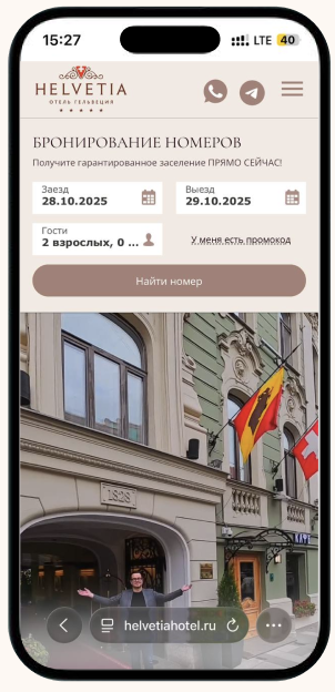 «Гельвеция» — городской бутик-отель в центре. Мы хотели подчеркнуть актуальность предложений, прозрачность условий и персональное сопровождение: удобный подбор номеров по типу, датам, бюджету и количеству гостей; понятные карточки с реальными фотографиями и планировками, списком удобств, включённым завтраком, правилами отмены бронирования и окончательной ценой без скрытых доплат; календарь доступности и промо-тарифы; гид по локации и сервисам отеля; быстрый контакт с менеджером по бронированию и консьерж-службой в один клик.