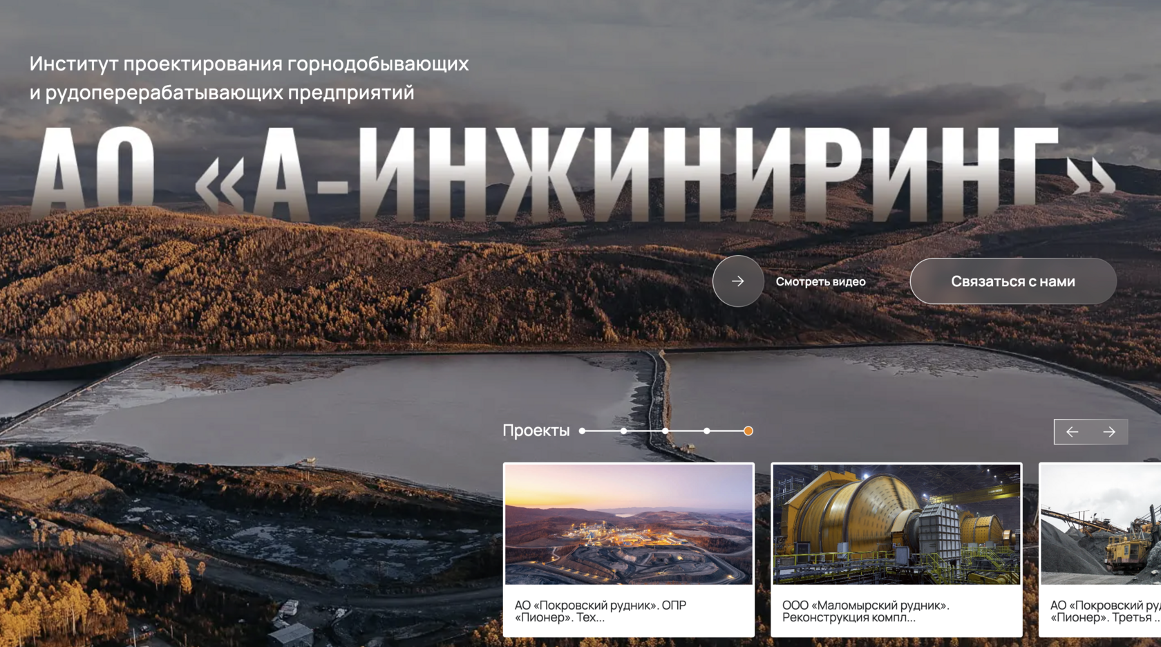 «А - Инжиниринг» — институт по проектированию горнодобывающих предприятий. Хотели подчеркнуть актуальные кейсы, честные условия и личное сопровождение: удобный поиск по типу месторождения, стадии проектирования и региону, понятные карточки проектов и услуг с ключевыми показателями и сроками, быстрый контакт с главным инженером.