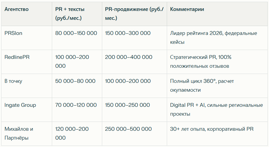 - Комплексный PR в СМИ (месяц): 40 000–300 000 руб.
