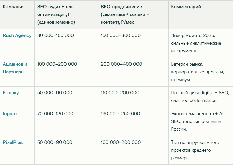 Часто выбирают для масштабных проектов и сложных ниш. Подходит бизнесу, который уже вырос из базового SEO.