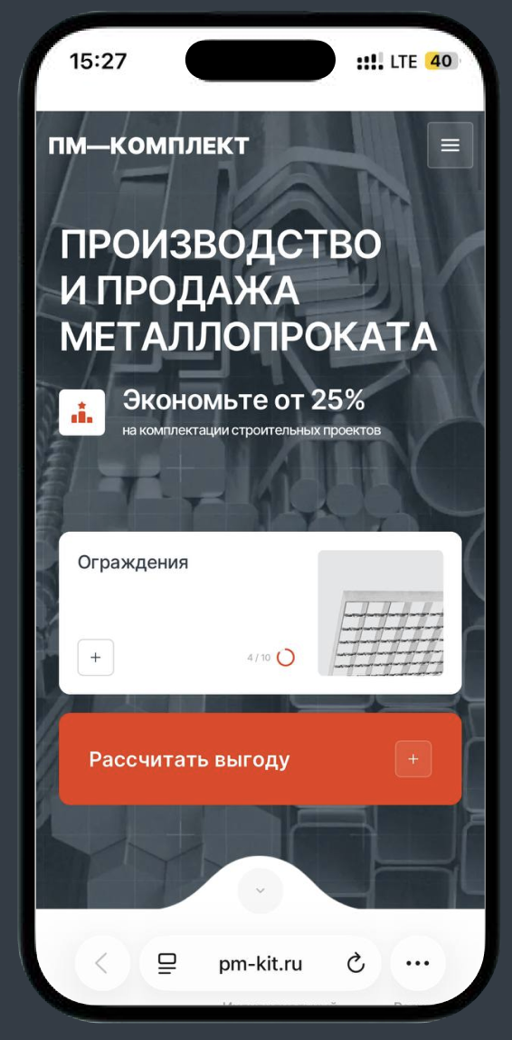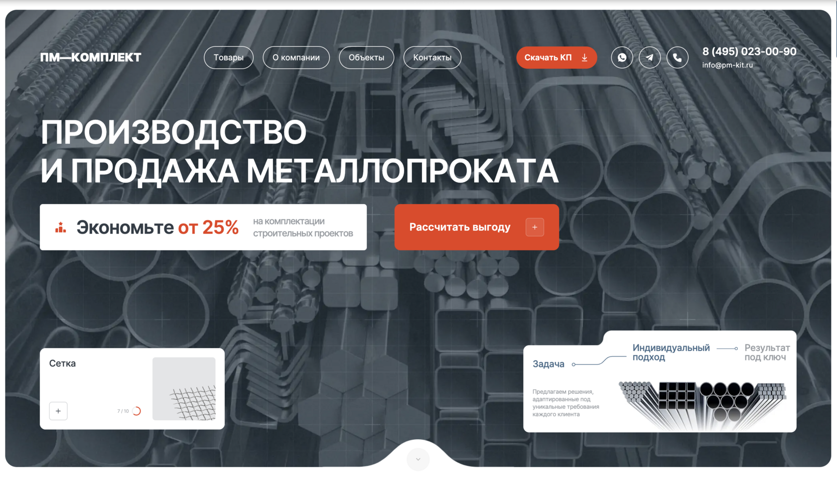 «ПМ - комплект» — компания по металлопрокату. Хотели подчеркнуть актуальные остатки, честные цены и личное сопровождение: удобный поиск по виду проката, марке стали и размерам, понятные карточки с ГОСТами и сертификатами, быстрый запрос КП и контакт с менеджером