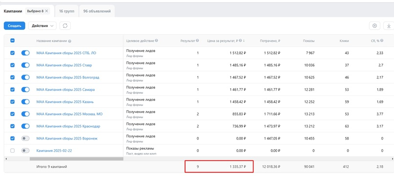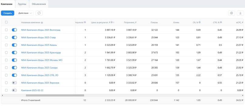 Показываю сразу цифры общей рекламной кампании в марте 2025. Забегая вперед, скажу, что это был единственный месяц работы, потому что набор завершился достаточно быстро.