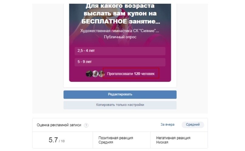 Заявок по форме оставили всего 1. Опросы в этот раз сработали лучше. То есть, родитель видит рекламу с опросом, голосует, а оператор с ним связывается и высылает сертификат на пробник. Такой вариант нативной рекламы дал недорогие заявки.