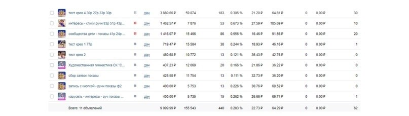И к каждой гипотезе 4-5 креативов с текстами и разными посылами. Исключил подписчиков сообщества.