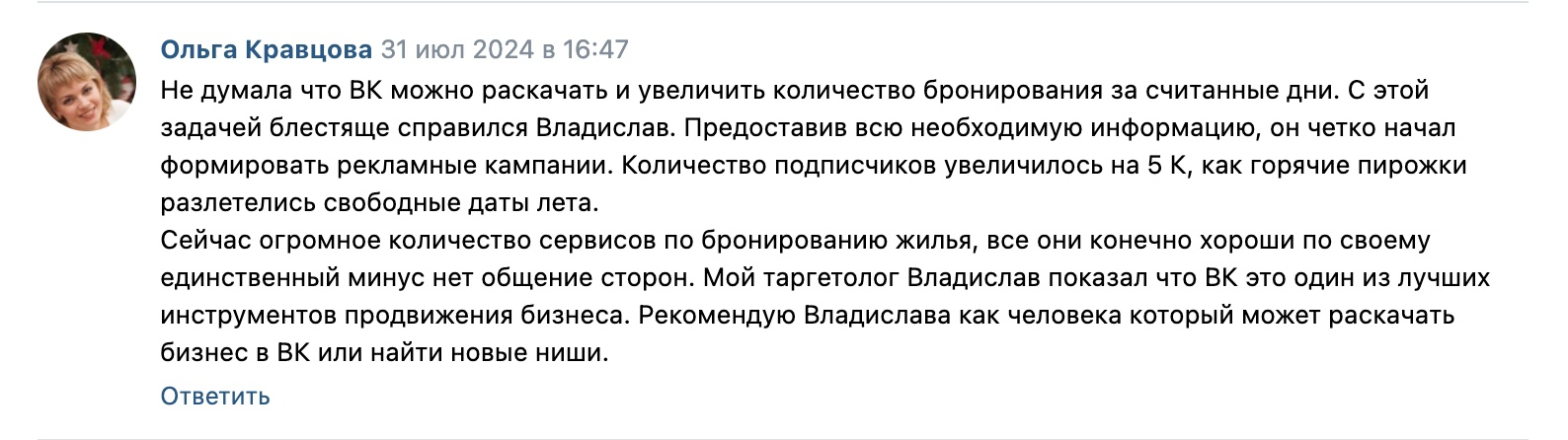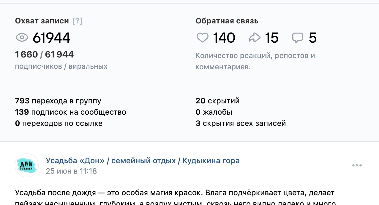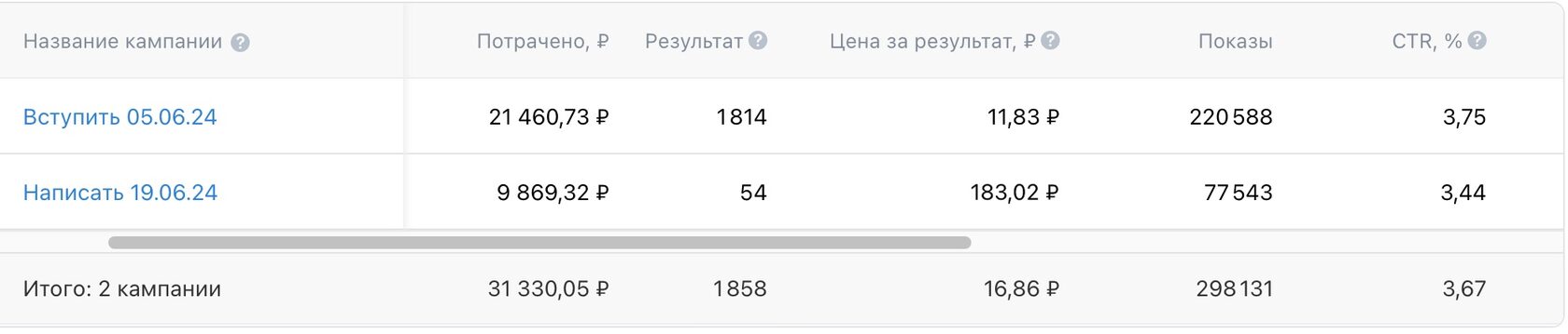 В середине июня, на очередном созвоне с заказчицей, было принято решение к вступлениям подключить трафик на сообщения группы, т.к. все летние выходные были забронированы и в июле осталась пара свободных дат.