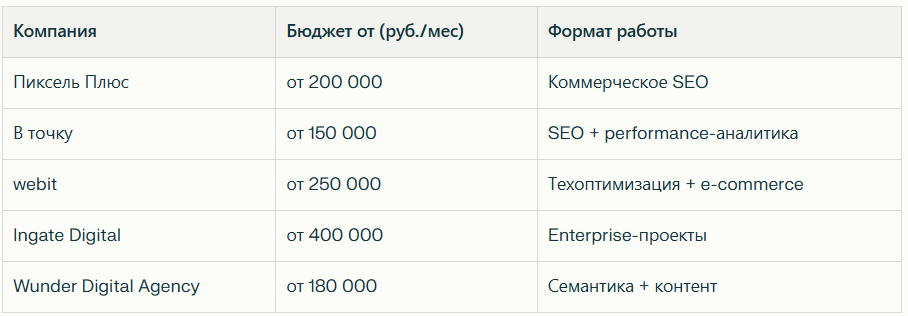 Пиксель Плюс возглавила рейтинг за коммерческие результаты, В точку на втором месте за performance-интеграцию SEO с бизнес-метриками, webit, Ingate Digital, Wunder Digital Agency задают стандарты технической экспертизы и контент-стратегий. Топ-5 для крупных проектов, середина — для SMB и ниш.