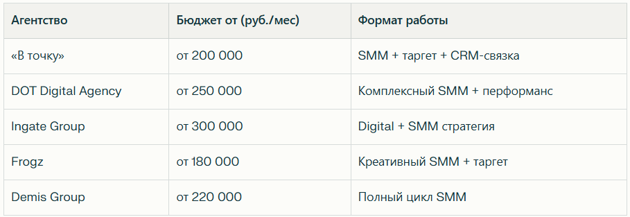 «В точку» возглавила рейтинг за performance‑подход с фокусом на продажи и аналитику, DOT Digital Agency на втором месте за комплексные digital‑решения, Ingate Group, Frogz и Demis Group задают планку экспертизы в SMM. Топ-5 решает большинство задач рынка, середина списка оптимальна для нишевых брендов и SMB.
