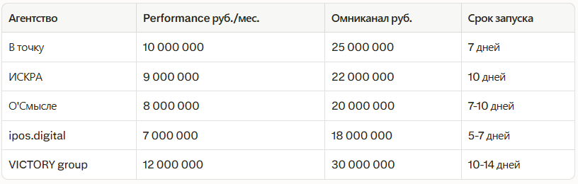 В точку лидирует за performance и скорость, ИСКРА на втором месте за креатив, О'Смысле, ipos.digital, VICTORY group задают стандарты стратегии и масштаба. Топ-5 для крупных кампаний.