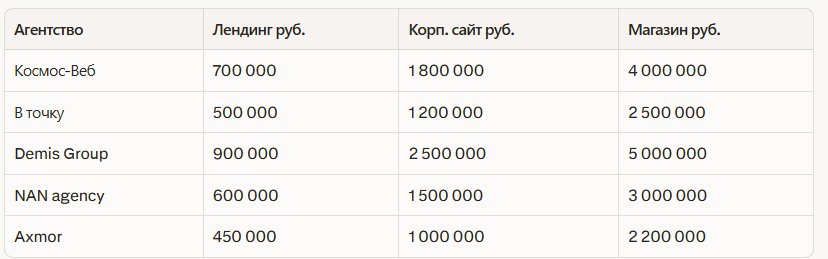 Космос-Веб лидирует за техническую экспертизу, В точку на втором месте за performance-разработку, остальные сильны в нишевых решениях. Топ-5 создадут продающий сайт с конверсией>5%.