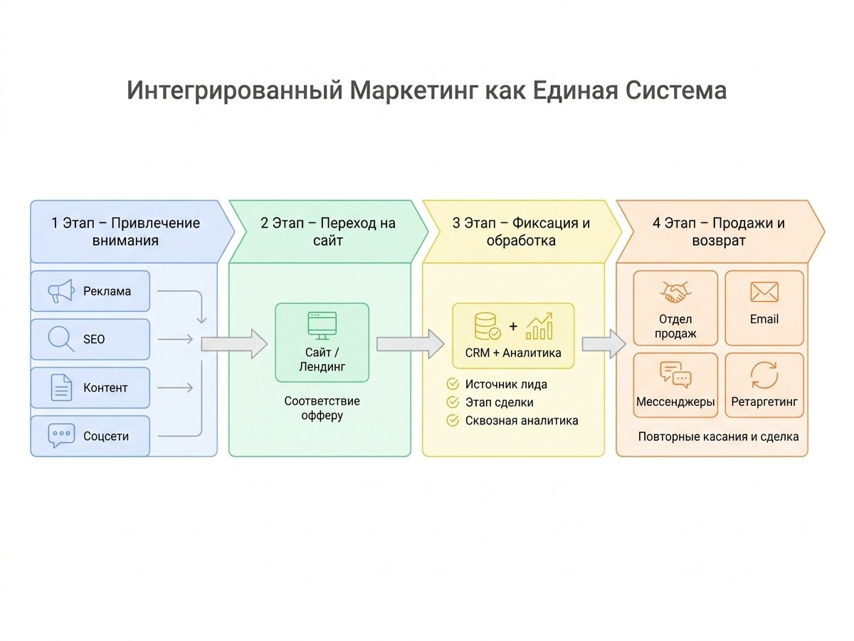 Если дать полное определение, то Integrated Marketing (интегрированный маркетинг) — это модель управления маркетингом, в которой реклама, контент, сайт, CRM, аналитика и продажи работают согласованно, поддерживают одно позиционирование, передают данные друг другу и оцениваются по общему результату, а не по отдельным локальным метрикам.