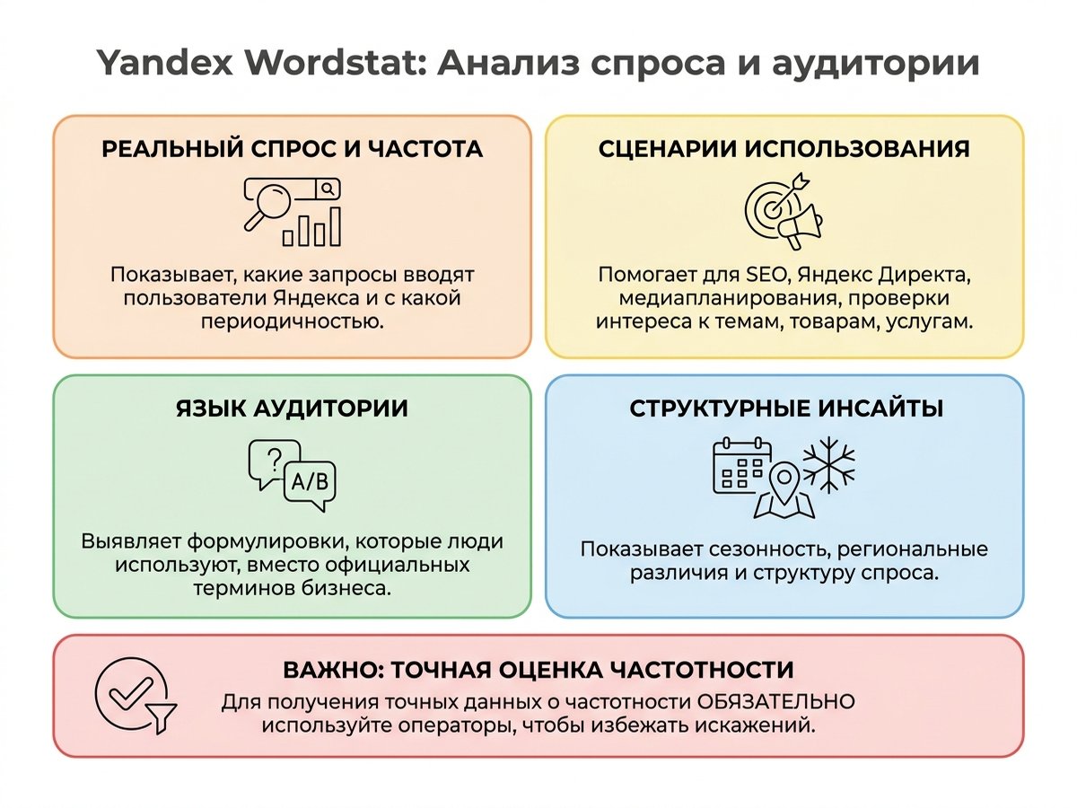 Когда спрашивают, что такое Yandex Wordstat, обычно имеют в виду сервис статистики поисковых запросов Яндекса. Но его польза шире, чем просто список фраз с частотностью. Он помогает проверить спрос перед запуском страницы, рекламной кампании, новой услуги или раздела каталога.