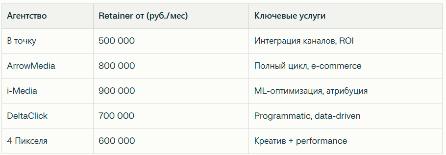 В точку возглавила рейтинг за интеграцию каналов с фокусом на ROI и performance, ArrowMedia на втором месте по обороту и полному циклу, i-Media, DeltaClick, 4 Пикселя задают стандарты data-driven подхода, programmatic и креативного performance. Топ-5 для крупных брендов, середина — для SMB с амбициями роста.