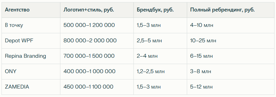 - Бренд-платформа + айдентика: 2 500 000–7 000 000 руб.