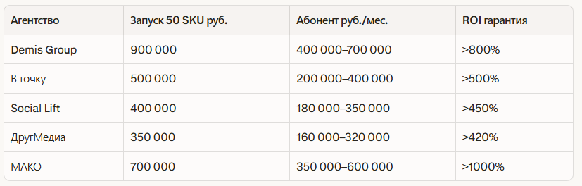 - Запуск 50 SKU: 300–800к руб.