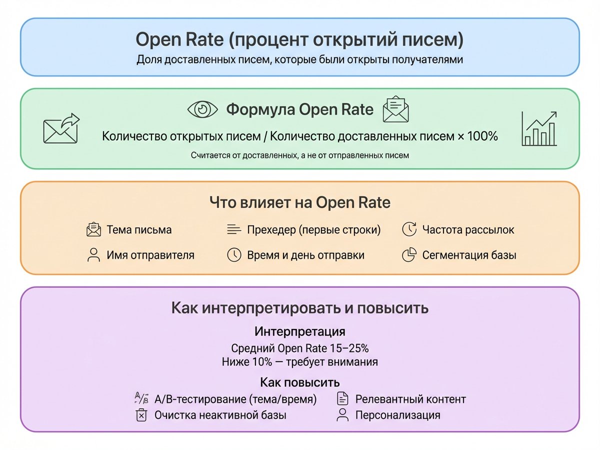 Open Rate полезен как ранний сигнал, что цепочка «доставка — открытие — клик — заявка» начинает ломаться.